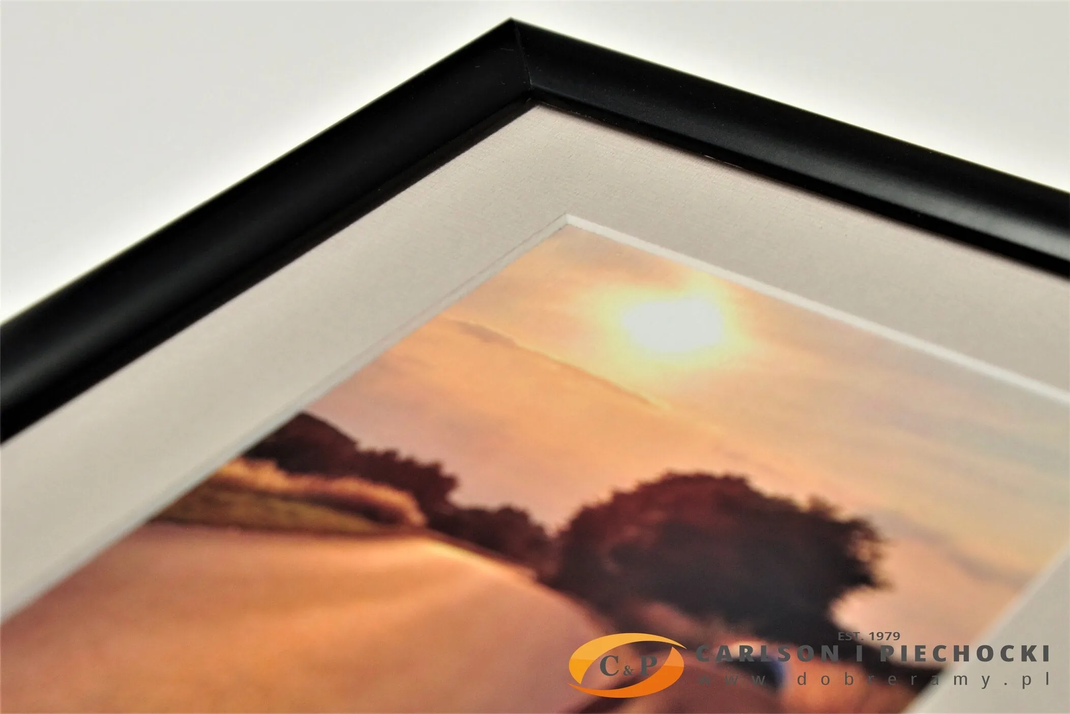 Passepartout czyt. “paspartu” posiada owalne okienko cięte pod kątem o różnych rozmiarach w zależności od wymiaru.