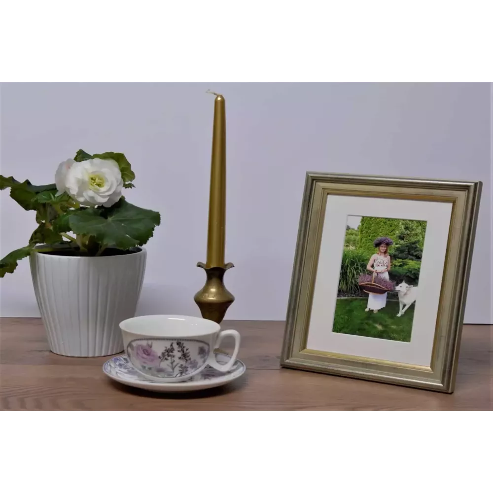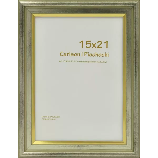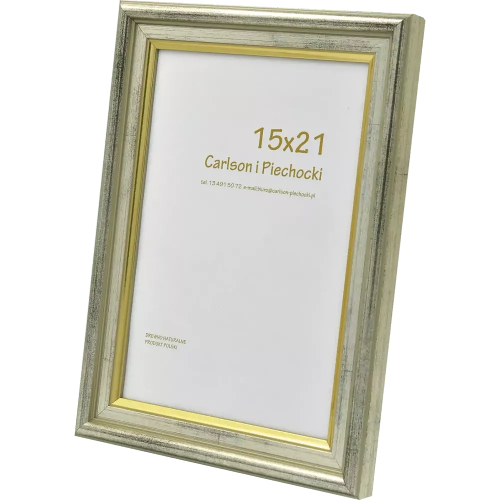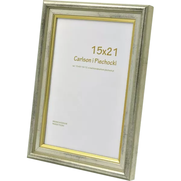 Klasyczna drewniana foto ramka w kolorze srebrnym z delikatnymi ciemnymi przetarciami z dodatkiem złotego paseczka. Profil o szerokości 2,5 cm. Ramka wyposażona jest w szkło zwykłe i plecki z płyty HDF o grubości 3 mm. Posiada zawieszki umożliwiające powieszenie zarówno w pionie jak i poziomie a do rozmiaru 15×21 nóżkę do postawienia. Przeznaczona do oprawy zdjęć, plakatów, dyplomów, grafik, wyszywanek, świętych obrazków. Idealna na komodę czy biurko. Produkt możliwy do łączenia w kompozycję z innymi rozmiarami i kolorami z tej samej serii, co spowoduje, że uzyskasz niepowtarzalną galerię fotografii. Ramka stanowi ważny akcent w aranżacji np. gabinetów, salonów, pokoi dziecięcych, młodzieżowych itp.