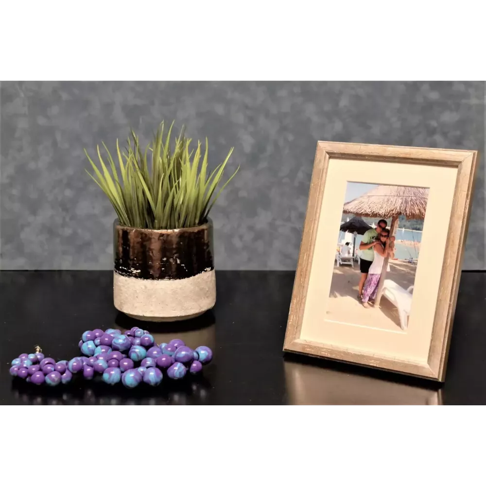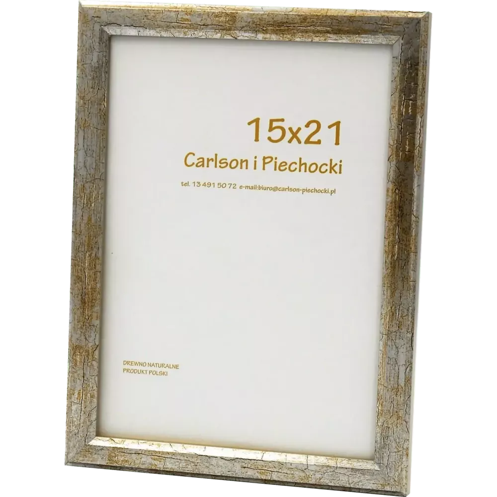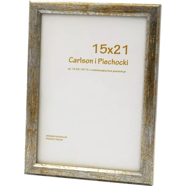 Nowoczesna drewniana ramka foto w kolorze starego, ciepłego srebra z rudo – brązowymi przecierkami imitującymi pęknięcia tzw. efekt cracle. Kształt profilu prosty o szerokości 1,5 cm. Ramka wyposażona jest w szkło zwykłe i plecki z płyty HDF o grubości 3 mm. Posiada zawieszki umożliwiające powieszenie zarówno w pionie jak i poziomie a do rozmiaru 15×21 nóżkę do postawienia. Przeznaczona do oprawy zdjęć, plakatów, dyplomów, haftów. Idealna na komodę czy biurko. Produkt możliwy do łączenia w kompozycję z innymi rozmiarami i kolorami z tej samej serii, co spowoduje, że uzyskasz niepowtarzalną galerię fotografii. Ramka stanowi ważny akcent w aranżacji np. gabinetów, salonów, pokoi dziecięcych, młodzieżowych itp.